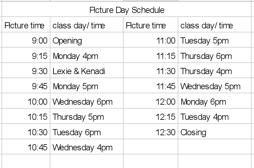 We will be doing pictures the morning of the recital at Leading Edge Academy. I am attaching the picture schedule for you. We will have 15 minute picture slots & then move to practice on the stage in costume. Pictures move quickly so please be on time. Once your child has taken pictures & practiced on the stage please take them home. There is so much happening that day it get tricky having extra kids running around ( yes they are running, they are so excited for their big day)